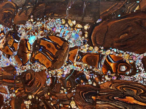 I have never seen something like this before, so when looking at the brown sedimentary rock pattern that resembles wood grain, I was really amazed to see the minerals in the cracks that were opalized and the small baby opal in the seams. We applied a nice smoothing filter to this abstract that brought it all together in a synergistic image.